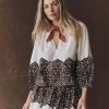 taper at the wrist. The western lace print runs along the hem, evoking classic cowboy detailing in a graphic, grounded way.
