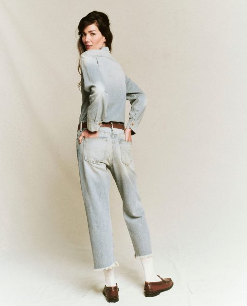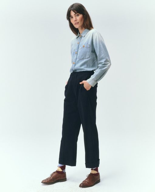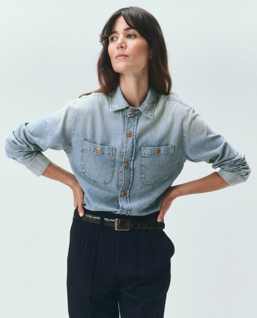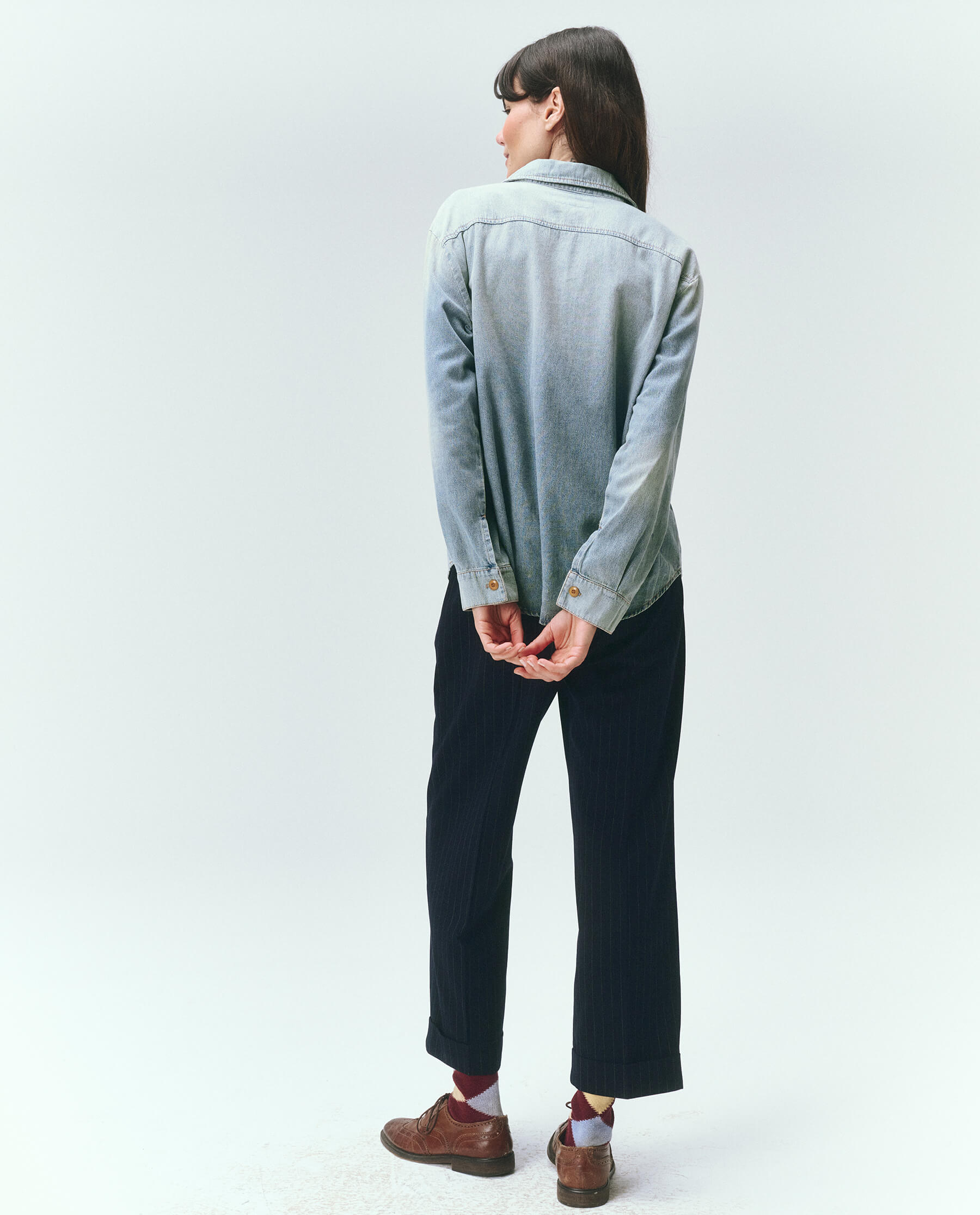 The Harbor Shirt. is a lifelong keepsake and closet staple. This vintage-inspired denim is perfectly washed and worn in a medium indigo shade. It has a boyish slouchy fit, classic tailored collar and sleeve cuff, natural shirting buttons, and two chest pockets stitched with workwear spice thread. Wear this with your favorite jeans for a head-to-toe denim look or unbuttoned over an easy dress.