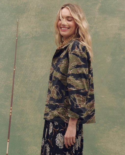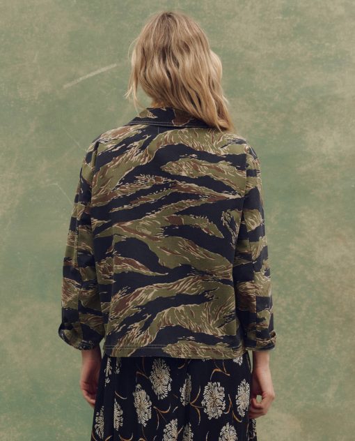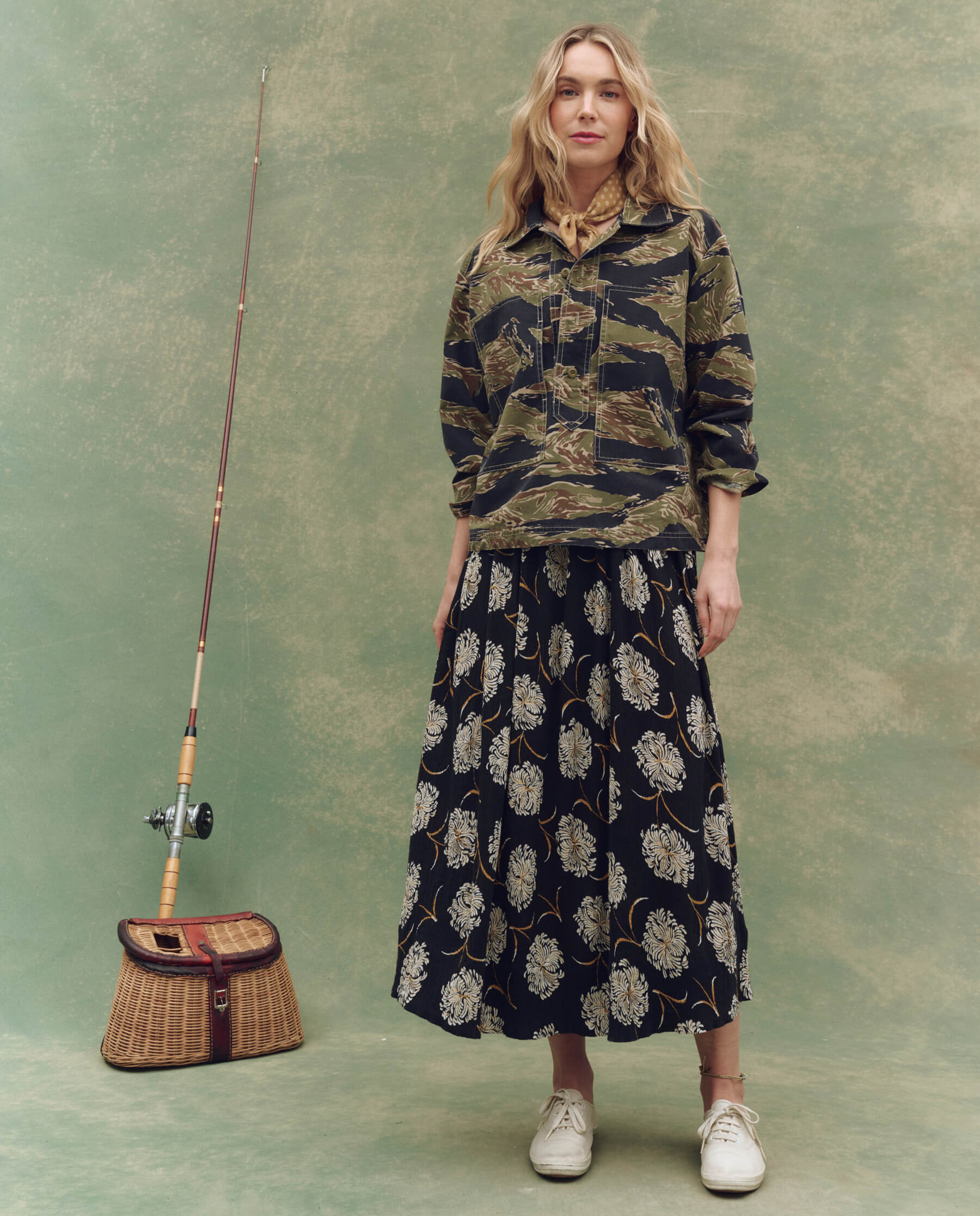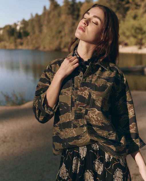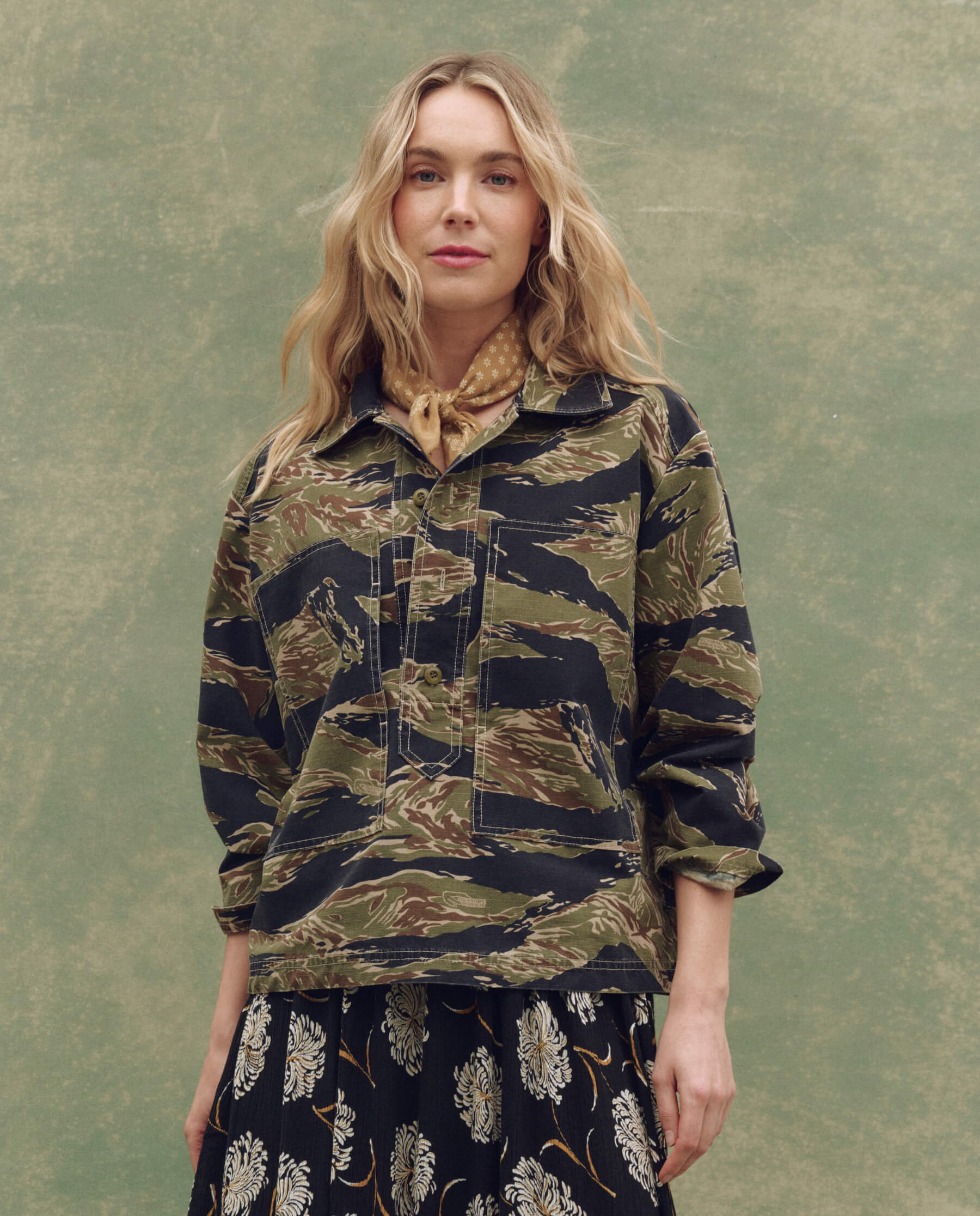 The Railway Shirt in Camo Surplus, is inspired by a vintage workwear top from the 1940s. Its relaxed, boxy fit and dropped shoulder offer a casual yet current shape. Featuring a shirt collar, oversized patch pockets, and corozo buttons. It's crafted from surplus military goods that we’ve repurposed from a Vietnam War era structured cotton camo, washed down to achieve the vintage hand-feel we love.