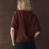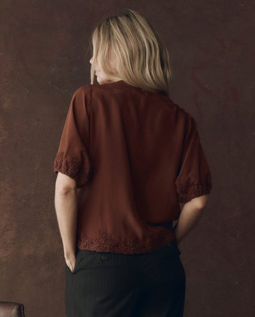 A soft nod to 1920s loungewear, The Short Sleeve Legacy Top features embroidered mesh lace along the V neckline and hem, with shirting buttons and