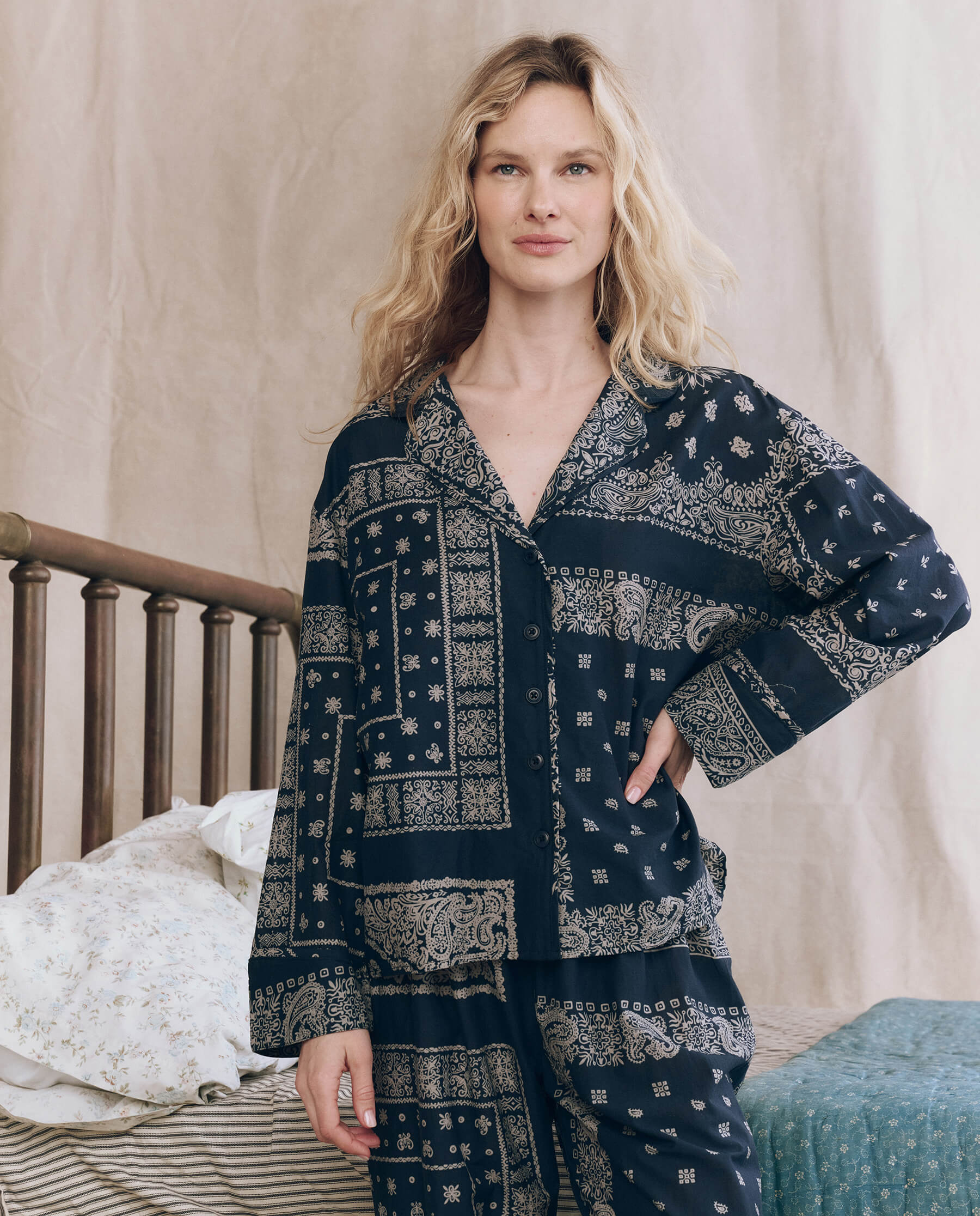 Made for cozy moments at home, The Pajama Shirt references men’s vintage pajama tops that we’ve always loved to borrow. Roomy and drapey, it features an open neckline, button front, and nostalgic sleepwear details. Made from printed cotton in our Bandana Patchwork Print and trimmed with piping, it pairs perfectly back to The Easy Sleep Pant for a coordinated set.