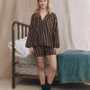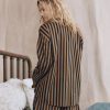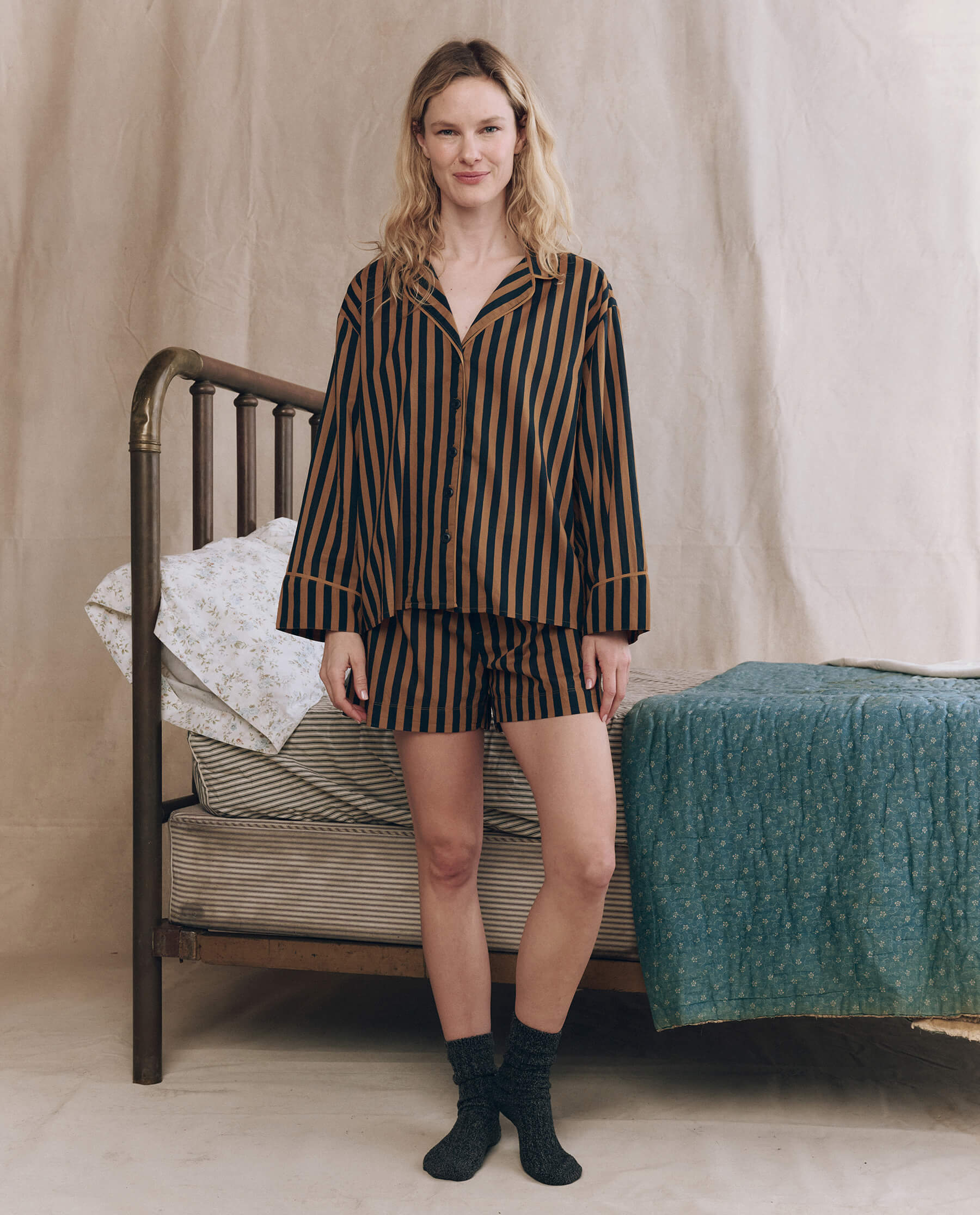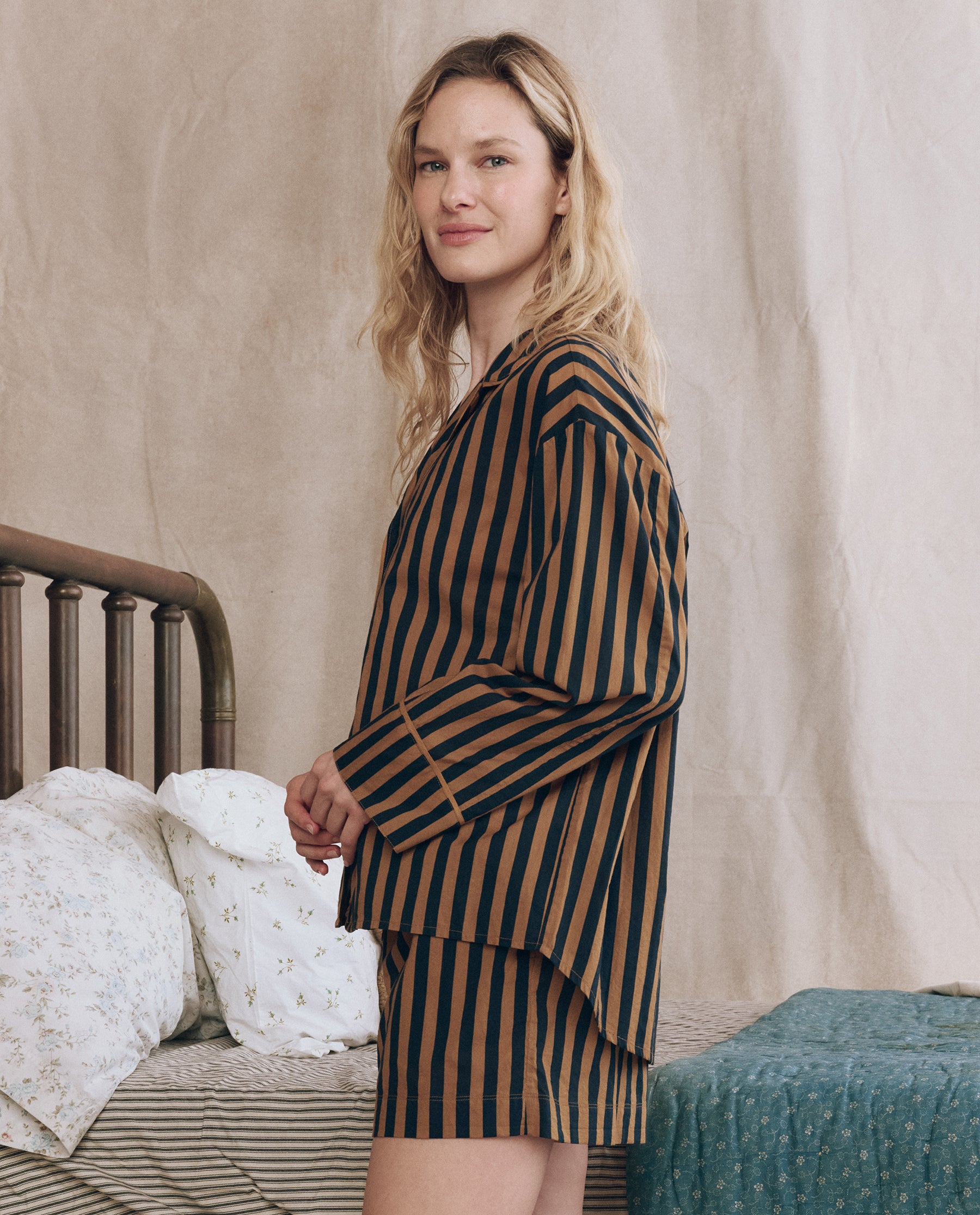 Made for cozy moments at home, The Pajama Shirt references men’s vintage pajama tops that we’ve always loved to borrow. Roomy and drapey, it features an open neckline, button front, and nostalgic sleepwear details. Made from printed cotton in our Club Stripe Print and trimmed with piping, it pairs perfectly back to The Easy Sleep Pant for a coordinated set.