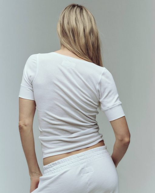 The Baby Rib Ballet Tee is a fresh take on vintage 1930s cotton undershirts, reimagined with a feminine edge. It features a scooped neckline with delicate binding, set-in short sleeves, and a wide, fine rib that adds structure and softness. Made from lightweight baby rib with a close-to-body fit and just the right amount of stretch, it’s as comfortable as it is timeless. Handcrafted in Los Angeles, ensuring no two pieces are exactly alike.