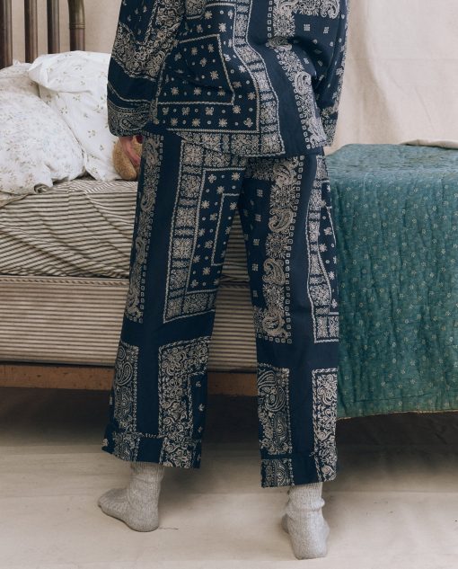 This sleep pant is crafted from the softest 100% cotton in the Bandana Patchwork Print. It features a wide leg, slightly dropped rise, an elastic high waist and piped cuff. Wear them with its matching sleep top for mornings at home.